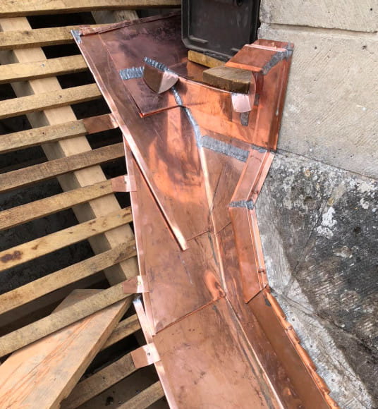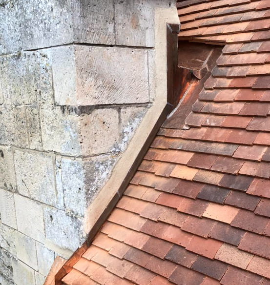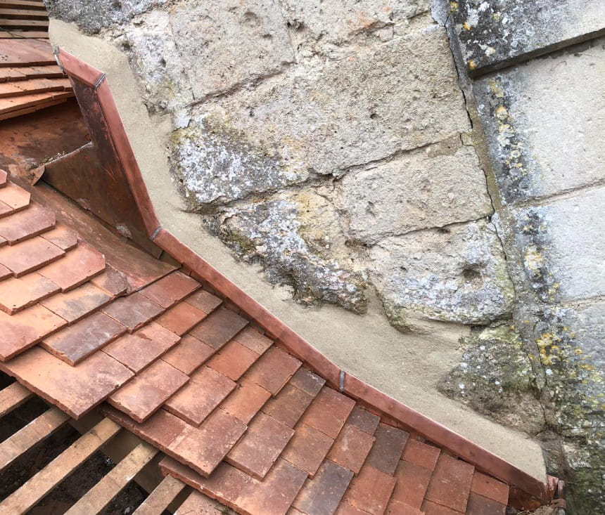 Pose d’une bande porte-solin en cuivre, façonnée pour épouser parfaitement la jonction entre la toiture et le mur. Le cuivre a été sélectionné pour sa longévité et sa résistance à la corrosion. -