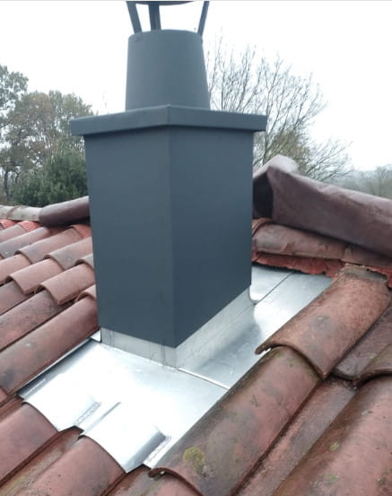 Réalisation d’un habillage complet de la souche de cheminée en zinc, façonné sur mesure pour épouser parfaitement les contours du conduit. Le zinc a été choisi pour sa durabilité, sa résistance à la corrosion et son esthétique. -