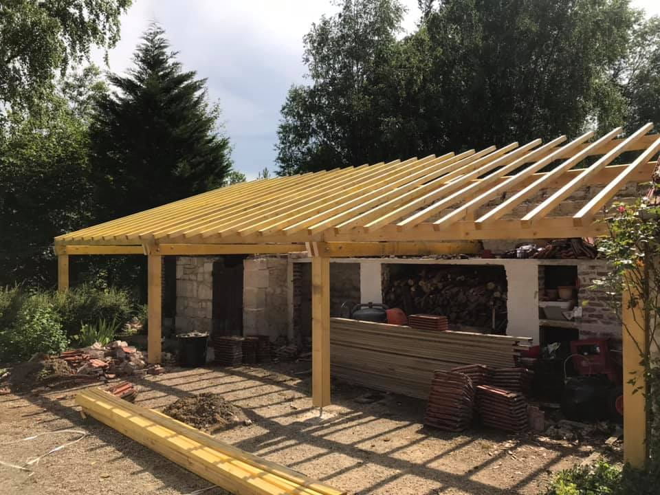 Vérification et renforcement de la structure existante. Pose d’une charpente en bois traité, dimensionnée pour supporter la nouvelle couverture. Alignement et nivellement précis pour garantir la stabilité.